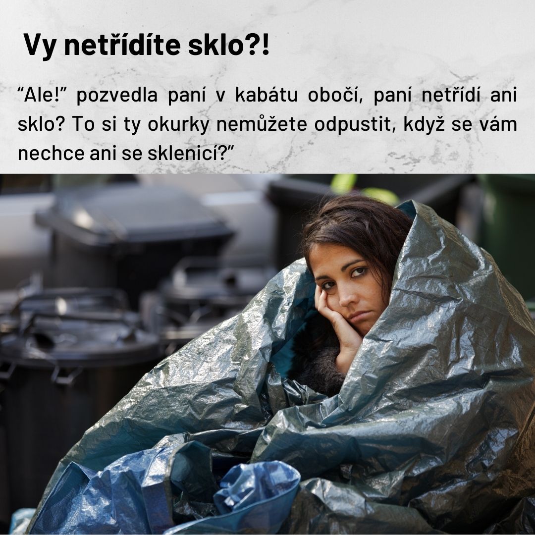 “Ale!” pozvedla paní ve vaťáku obočí, paní netřídí ani sklo? To si ty okurky nemůžete odpustit, když se vám nechce ani se sklenicí?”
