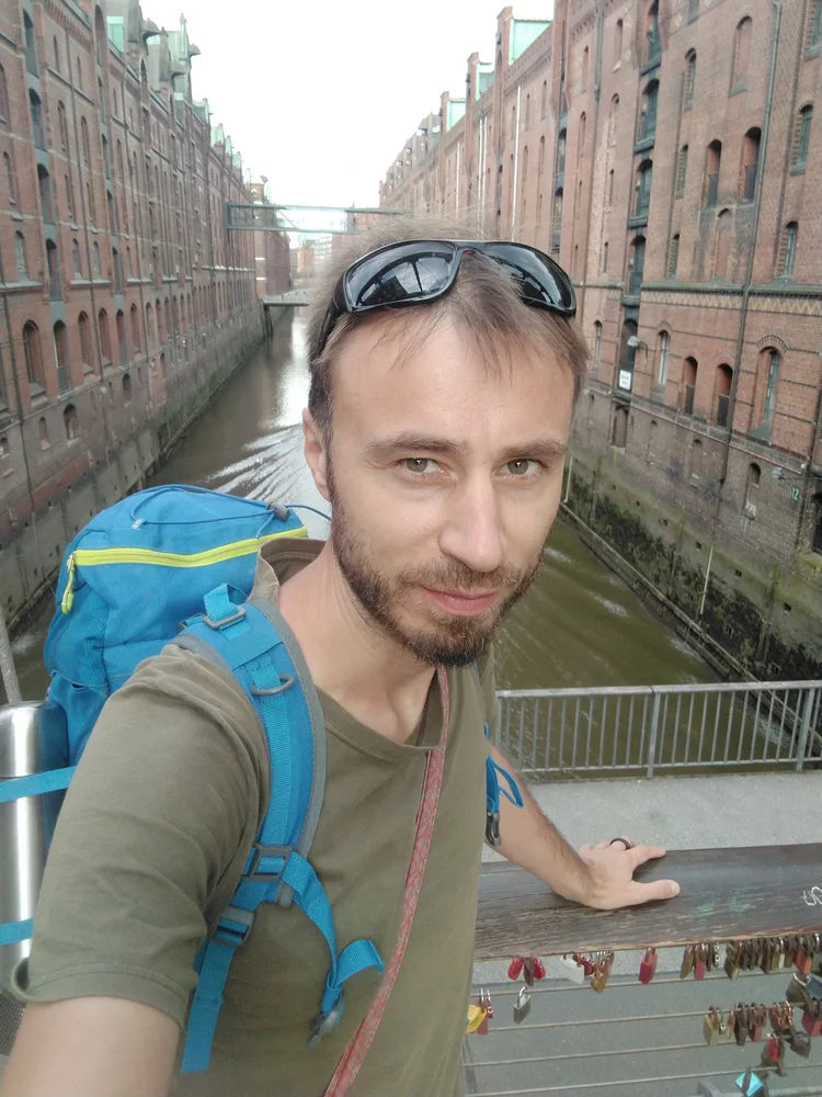 San Piego leží na Labi. Stejně tak Hamburk. Stejná řeka. A přitom úplně jiná. Řeky jsou pro tebe důležitý. A vidět “tvoji” řeku v Hamburku je neskutečnej zážitek. Labe se před Hamburkem štěpí na severní a jižní větev a vytváří ve městě desítky kanálů. Stojíš u Severního Labe a zíráš na tu šířku. Mrazí tě z toho a máš slzy v očích.