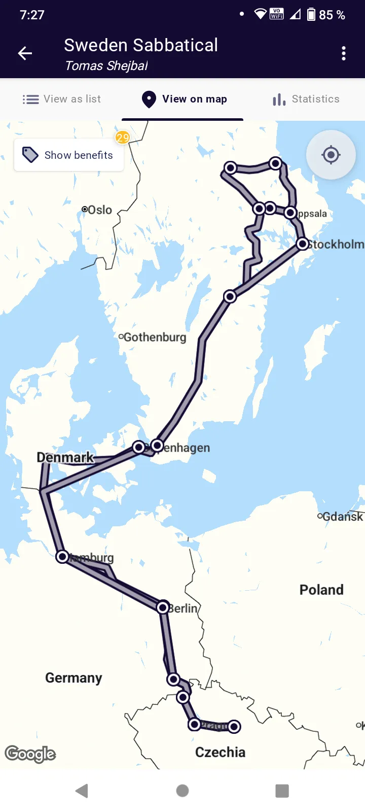 Záznam obrazovky z appky interrail: trasa Pardubice - Lund
