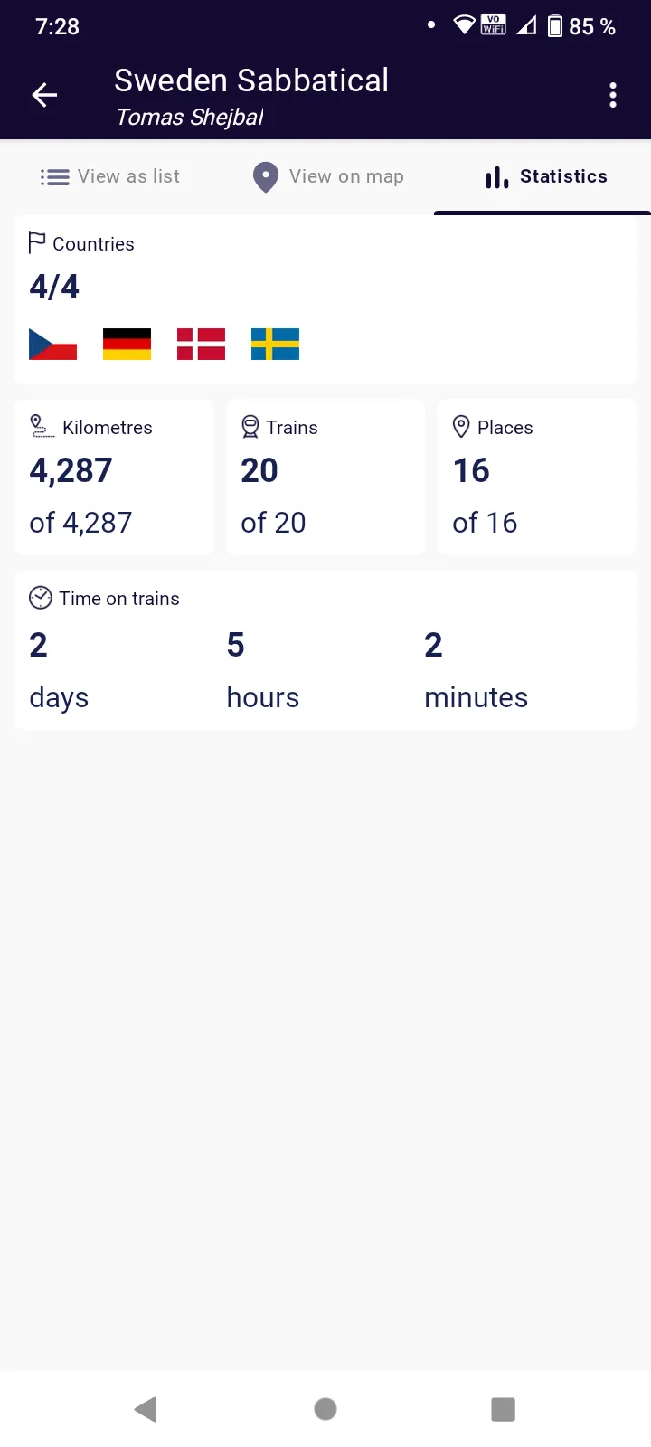 Statistiky za pět dní cestování ve vlaku