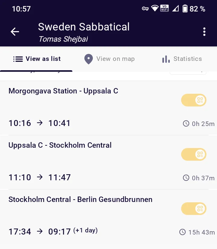 Snímek obrazovky z appky interrail: Přejezd z Morgongavy do Stockholmu a expres do Berlína