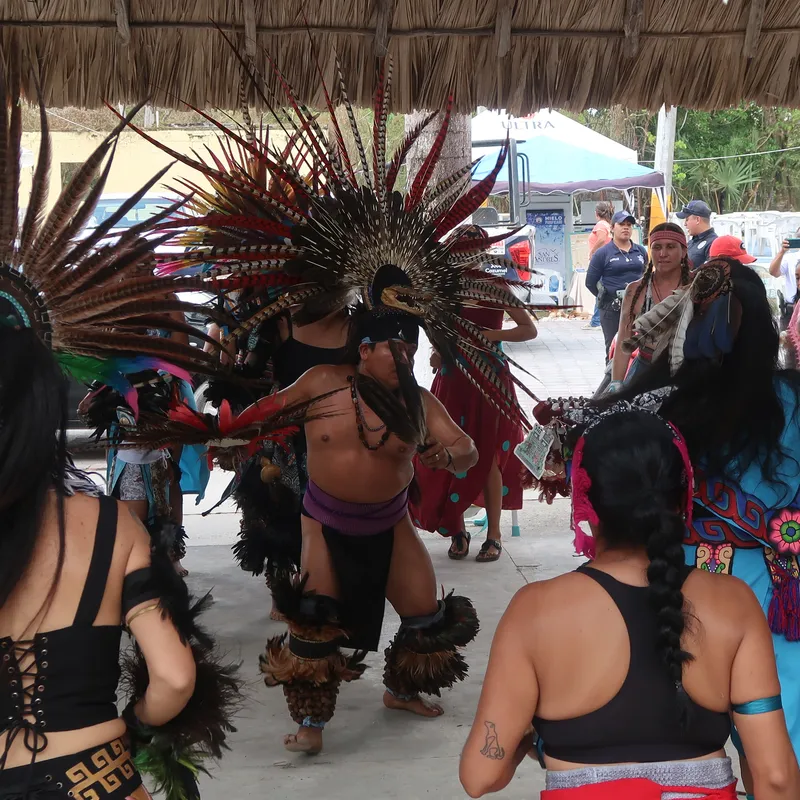 Po mayské mši a spoustě vykuřování a přinášení ovocných obětin začíná tanec. Mayové (až na pár výjimek jde zřejmě o lidi s indiánským původem) buší do bubnů, tančí tak, aby při pohybech zněly kolem lýtek navěšené mušle. Z toho víru barevných per, kožešin a krokodýlích hlav, jde i ta tvoje hlava kolem. Po chvíli za nimi přibíhá mužík a klidní je, že vedle probíhá mše. Kupodivu se Mayové ztiší a čekají, než nekonečná katolická mše dojde svého konce, což se nakonec skutečně stane.