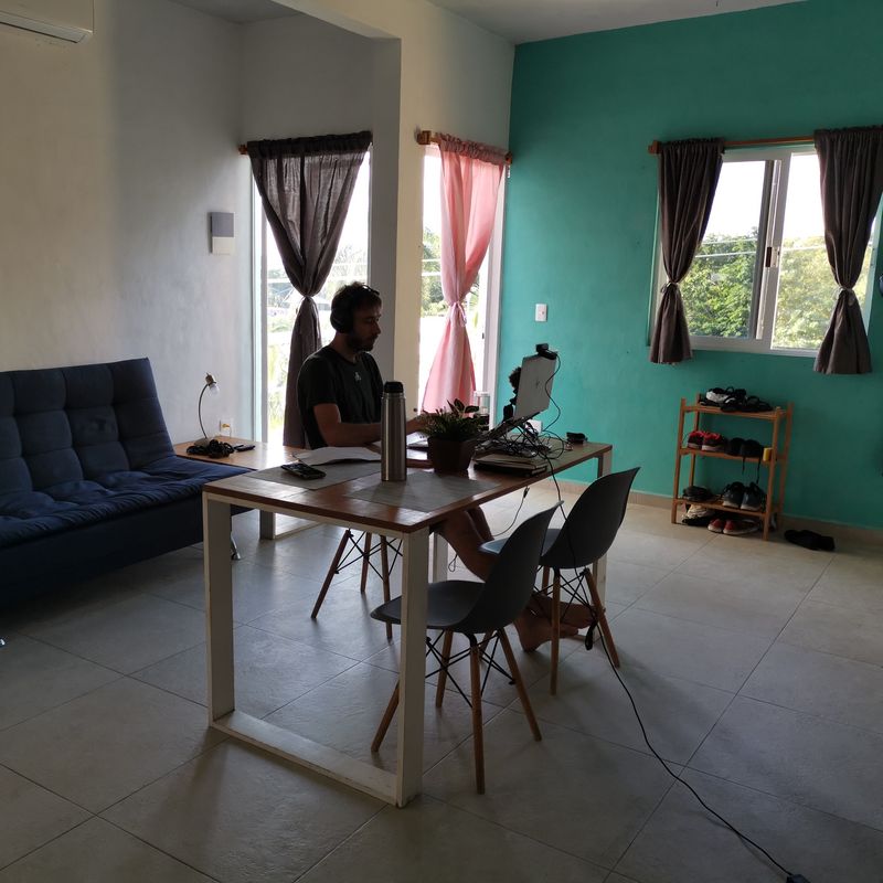 Taky tam José Manuel neměl jediný stůl. Já bych klidně pracoval i na kuchyňský lince. Ačkoliv v ČR vyžaduji precizní pracoviště, na cestách je moje nastavení spíš ve vděčnosti, že můžu pracovat ze zahraničí. Moc pak neřeším, jak pracoviště vypadá.
