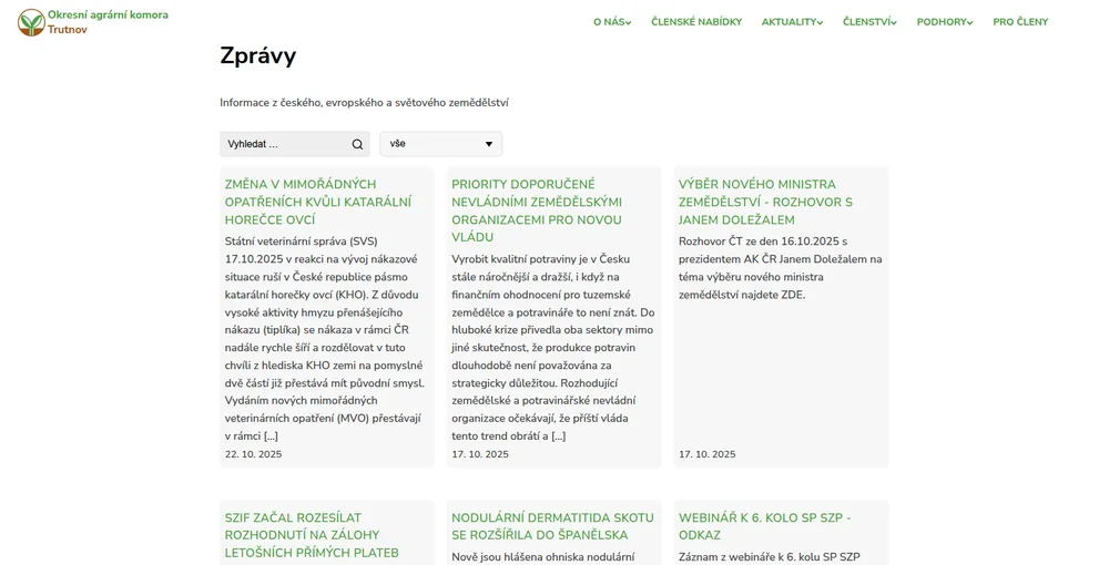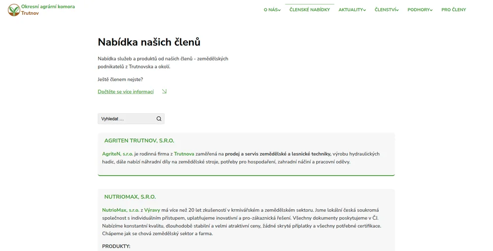 Okresní agrární komora Trutnov potřebovala komplexní webové řešení, které by spojilo dva samostatné projekty - web organizace a web výstavy zemědělské techniky Podhory. Výsledkem je moderní web s důrazem na přehlednou správu obsahu, pokročilou filtraci a členskou sekci.
