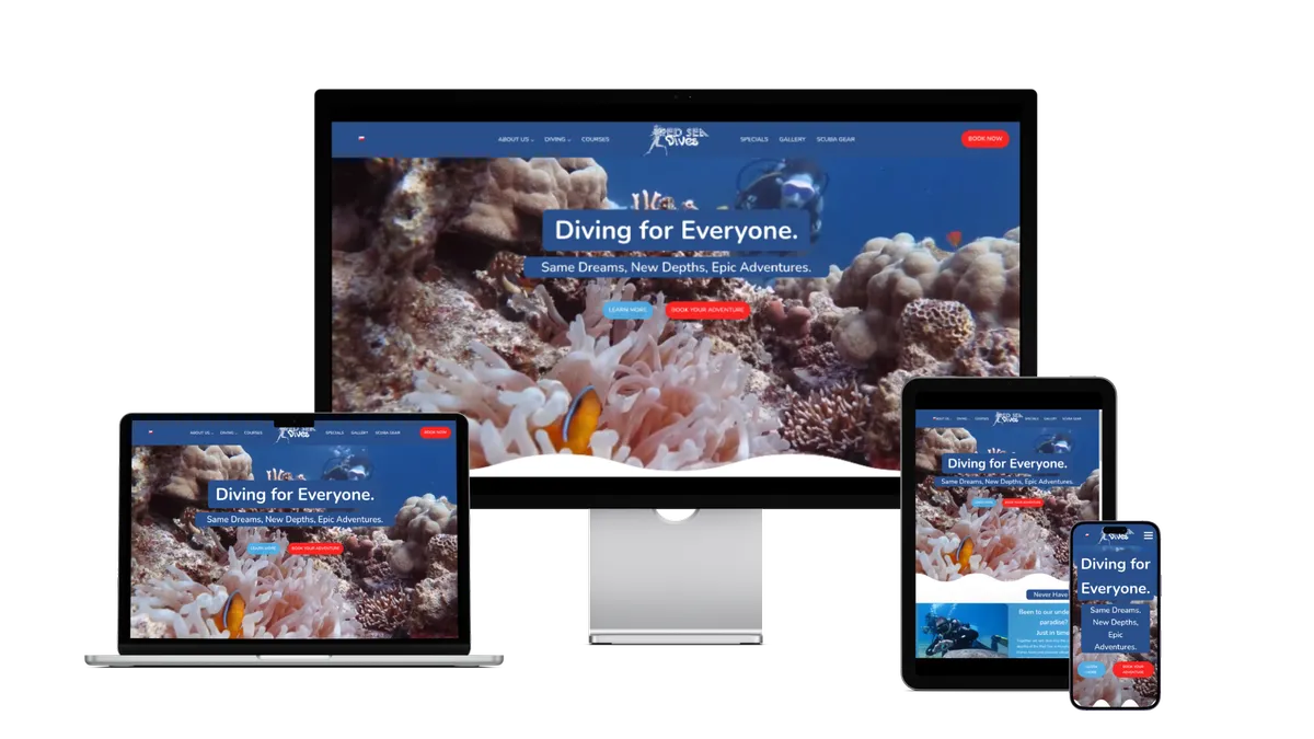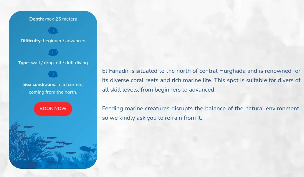 Kurzy jsem rozházel do několika sekcí, které se liší pozadím, přechody mezi sekcemi s motivy korálů a písečného dna. Důležité informace jsou přehledně uspořádány v modrých kartách s výraznými červenými tlačítky s jasnou výzvou: Rezervovat (viz obrázek výše).