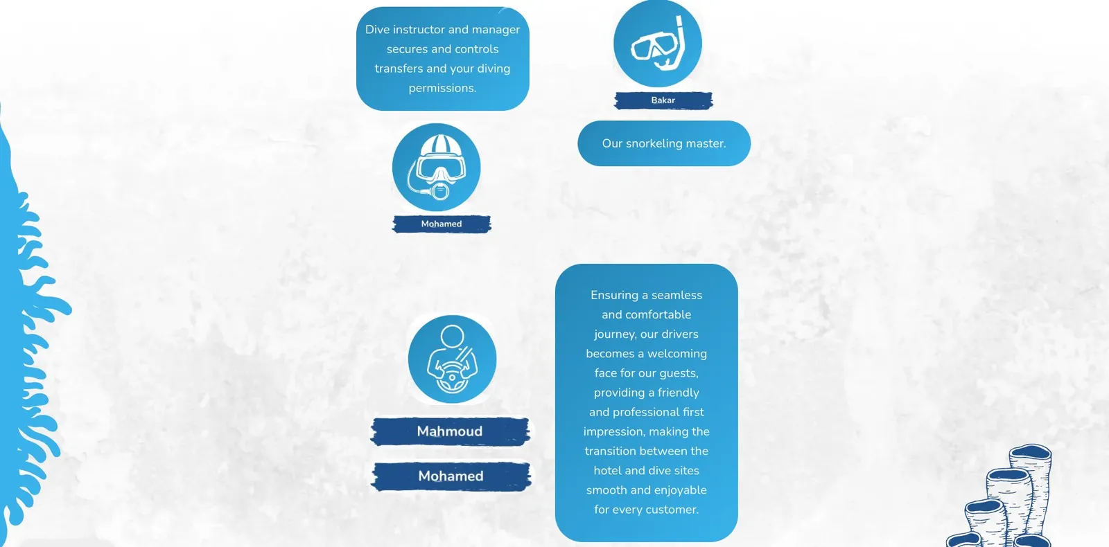 Design pracuje s klientovou vizí červeno-modré barevné kombinace, kterou doplňují podmořské prvky - korály, vlny a různé potápěčské motivy.