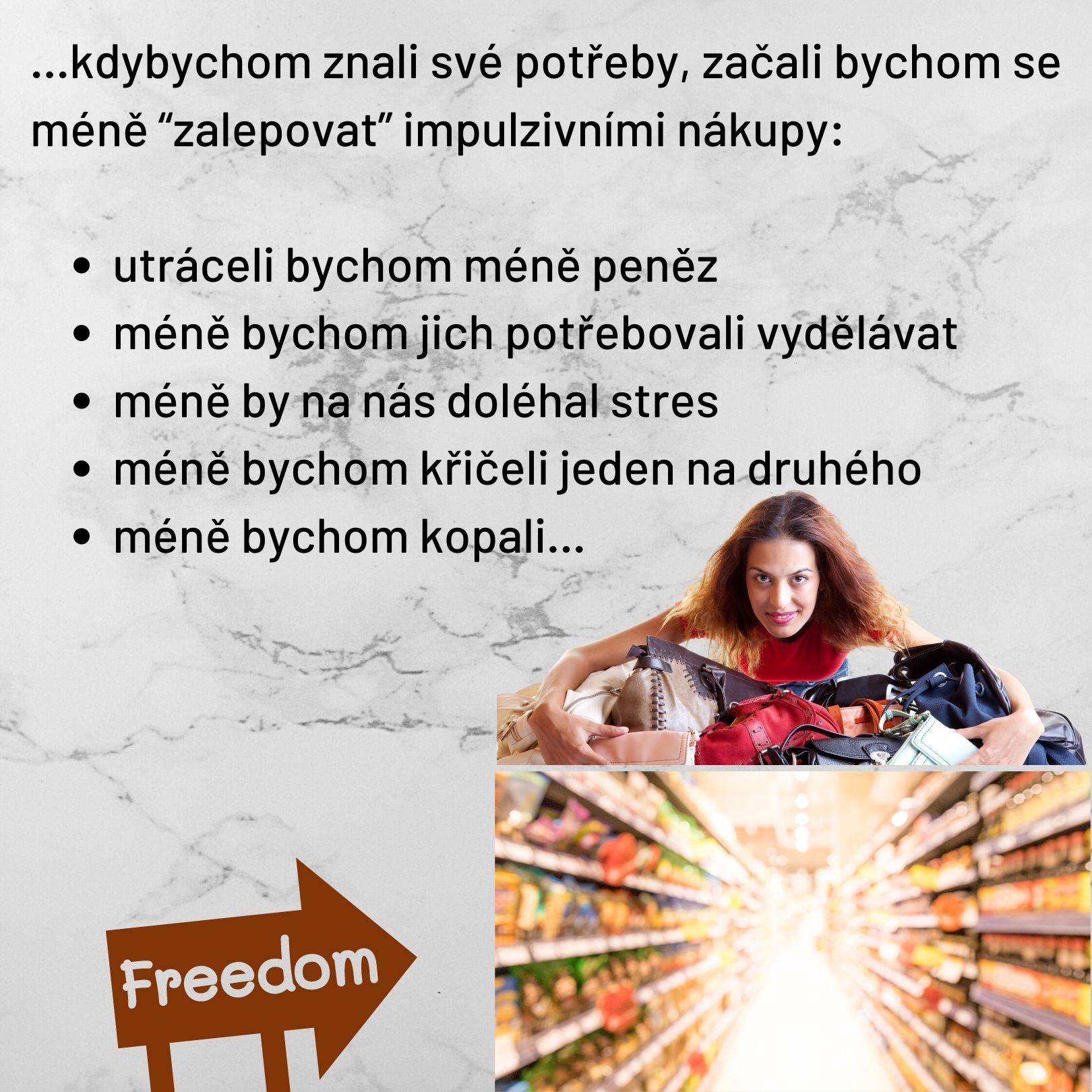 Jen abychom neviděli, že to uvnitř pěkně zatuchá. Věřím, že kdybychom znali své potřeby, začali bychom se méně “zalepovat” impulzivními nákupy → utráceli bychom méně peněz → méně bychom jich potřebovali vydělávat → pociťovali bychom méně stresu → méně bychom křičeli jeden na druhého, méně bychom kopali… aspoň tak vnímám já svou vlastní životní proměnu, která samozřejmě nepřišla ze dne na den. Trvala dlouhé roky. A trvat dál bude.