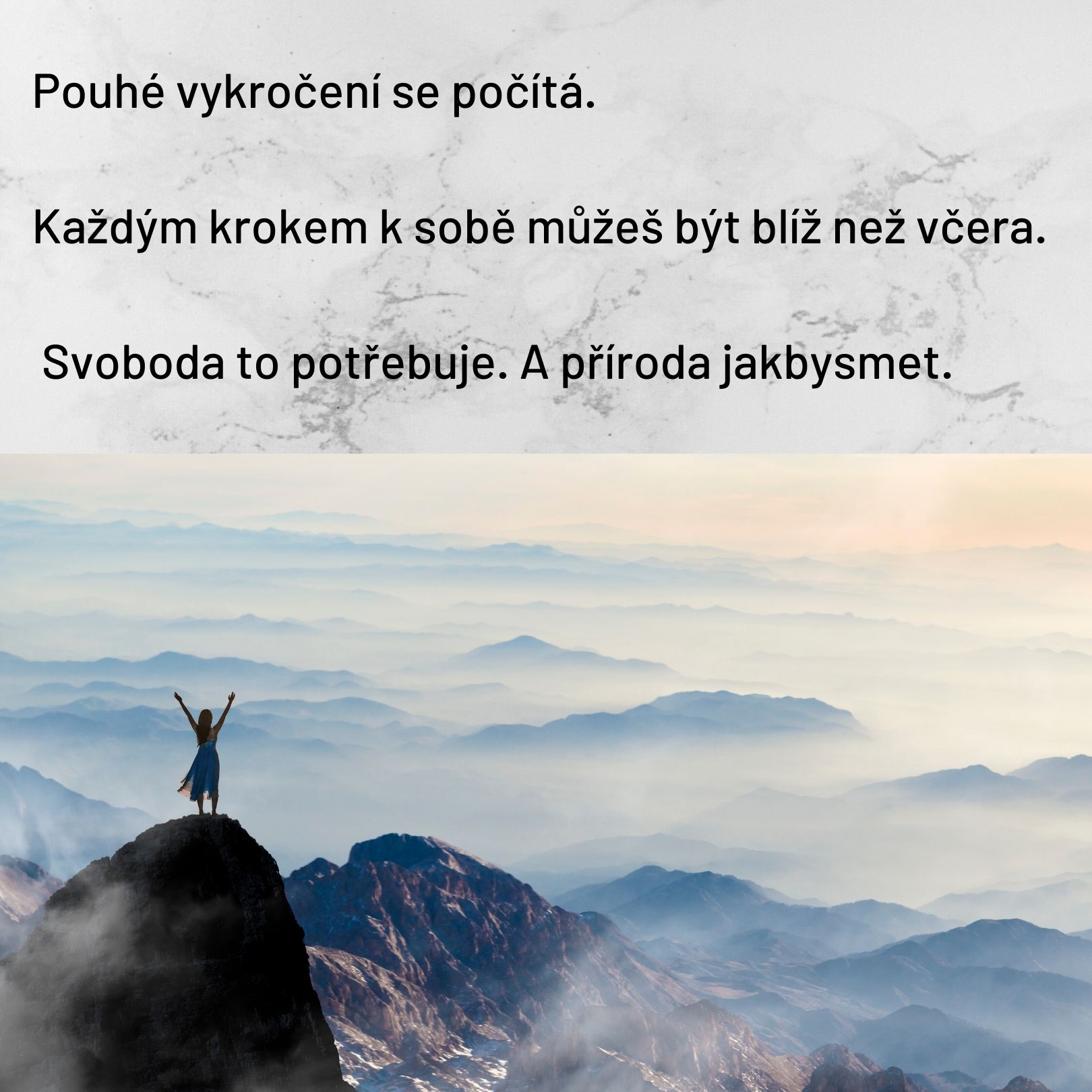 Samozřejmě jsem milovníkem svobody a je pro mě důležitá. Jen se mi nelíbí vychýlení misek vah k té vnější svobodě. O té se (až prázdně) hovoří neustále. Přijde mi, jak kdyby nám vnitřní svobodu někdo zabalil do fólie. Aby moc nevyskakovala. Možná abychom na ni viděli hůře i my sami. Ale zase ze sebe nedělejme oběti.