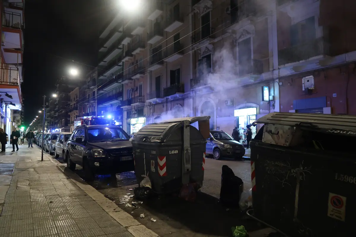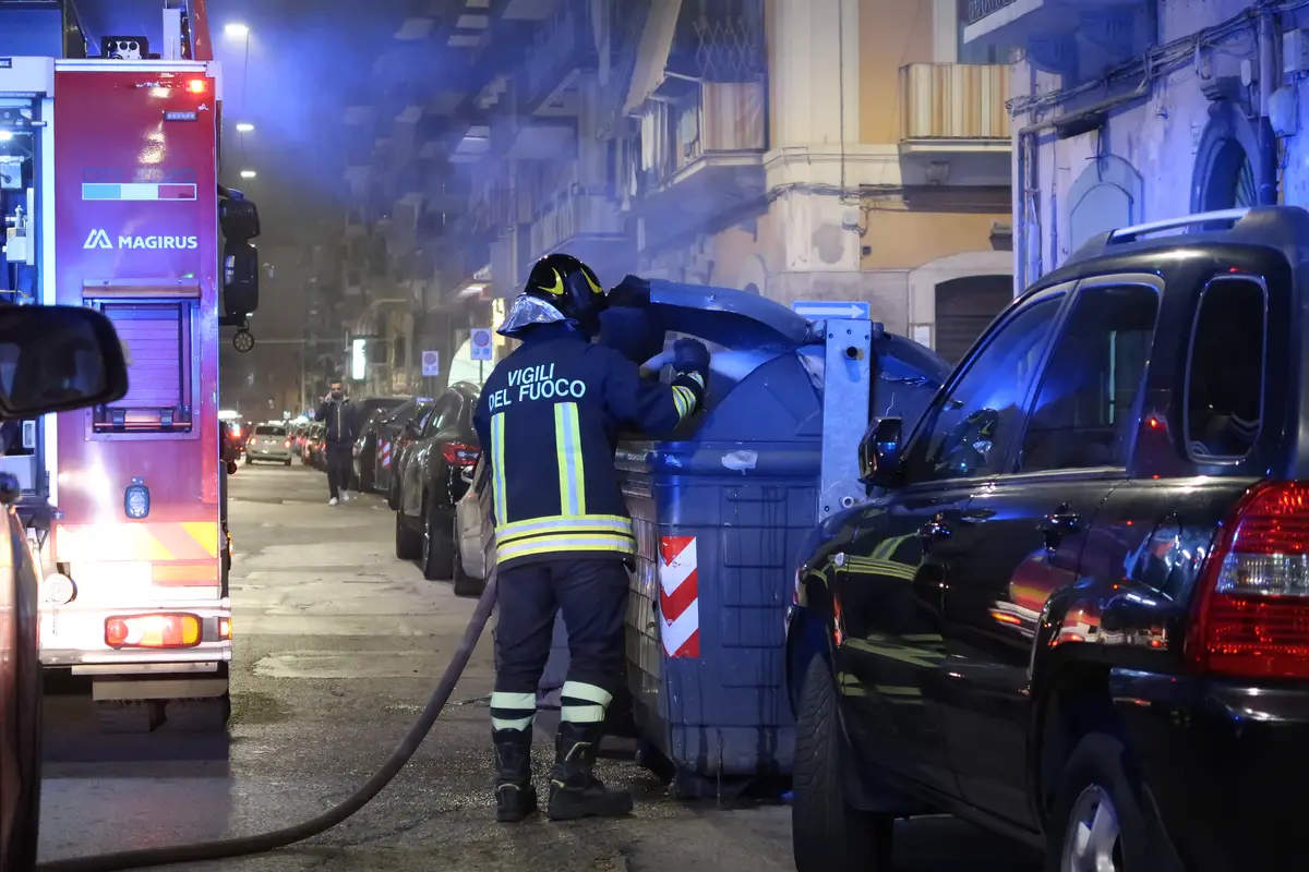 Doutnající kontejner ve čtvrti Libertá, Bari. Ke kontejneru právě přijíždějí hasiči.